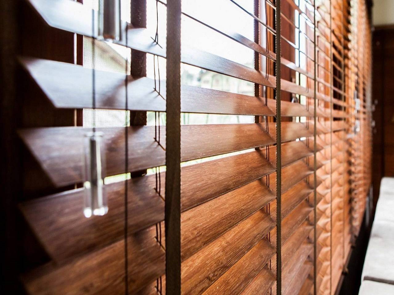 Горизонтальные деревянные жалюзи — изготавливаются из лёгких пород дерева (липа, кедр, бамбук), подходят для гостиных, кабинетов и спален.